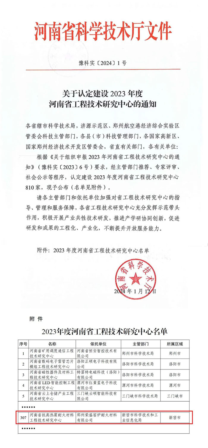近日,河南省科學(xué)技術(shù)廳發(fā)布了《關(guān)于認(rèn)定建設(shè)2023年度河南省工程技術(shù)研究中心的通知》。經(jīng)申報(bào)、主管部門推薦、專家論證和研究等程序,鄭州榮盛窯爐耐火材料有限公司(以下簡(jiǎn)稱“榮盛耐材”)申報(bào)的“河南省抗高熱震耐火材料工程技術(shù)研究中心”正式獲批。