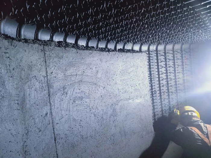 由于無基礦物質原料含有一定的水份,在配制成澆注料過程中又加進了一定量的水做溶劑,這些水份需要通過自然干燥及熱養護將水份排出,因耐磨耐火澆注料的致密度較高,其結晶水又在其分子結構內部,所以熱養護烘爐是需要足夠時間的過程。雖然熱養護采用可控溫熱煙氣養護,但養護時鍋爐受熱面還是要加水來保護其安全。通常熱養護的升溫曲線由材料供應商提供,或由供應商認可的升溫曲線來進行。熱養護后,所有在密封盒上開的澆注孔需要封閉并且焊好,所有為熱養護開的蒸汽通道均應封焊。