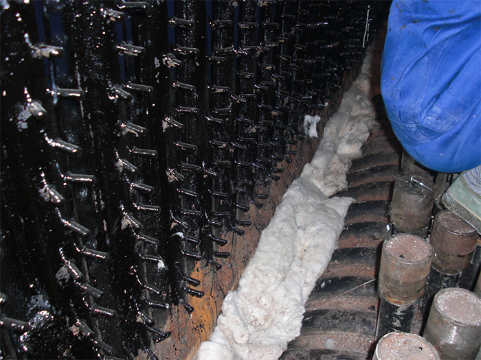 因金屬材料與耐磨材料受熱后線脹系數的差異,在耐磨耐火材料施工前,必需在金屬材料( 包括銷釘, 托板及管子) 表面涂瀝青, 涂刷瀝清是在澆注料與受熱面之間留有一定的間隙, 運行時受熱面熱膨脹差不會對耐磨材料造成破壞。